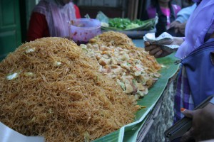 berbagai macam menu takjil di pasar sore Ramadhan Kauman ini. Pedagang menjajakan menu takjilnya di meja-meja kecil yang di tata di sepanjang gang ini. Ada juga beberapa di antaranya menggelar alas plastik di jalanan gang dan menjajakan dagangannya di atasnya. Ada salah satu penjual yang menarik perhatian saya, seorang Ibu menggelar takjil berupa bakmi dan cap cay dengan membentuknya seolah menjadi sebuah gunung bakmi. Rata-rata dagangan dijual di ruang terbuka, tidak ditempatkan dalam ruang tertutup misalnya diberi sekat plastik atau kain. Bagaimana dengan higienitas dari barang dagangannya, apakah tidak takut terkena debu