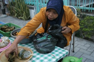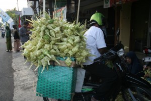 janur. Tentu saja belum ada isinya, alias masih kosong. Ketupat-ketupat kosong ini ditempatkan di keranjang yang diletakkan di kursi belakang motornya. Mungkin menjelang hari raya Idul Fitri yang sebentar lagi akan tiba, si penjual memanfaatkan situasi untuk mencoba keberuntungan dengan menjual ketupat janur ini.