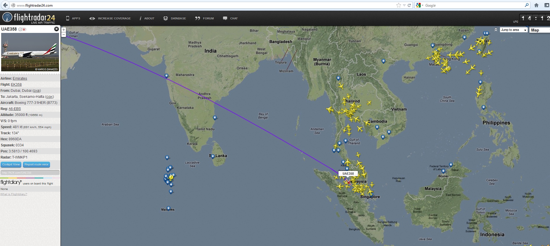 akan dihadapkan pada suatu GIS map window dengan miniatur-miniatur pesawat yang berwarna kuning dan orange. Di pojok kanan atas ada drop down menu yang bisa kita gunakan untuk memilih lokasi yang kita mau untuk ditampilkan di GIS map-nya Flightradar24. Saya mencoba untuk mengecek posisi pesawat Emirates Dubai – Jakarta EK-358 yang berangkat dari Dubai kurang lebih jam 11 pagi waktu Dubai. Saat saya sedang menulis sekarang ini harusnya posisi pesawat Emirates tersebut sudah dekat dengan Jakarta. Yang saya lakukan adalah memasukkan kata kunci ke mesin pencari “Search flight” yang ada di pojok kiri atas dengan menuliskan “EK-358”.