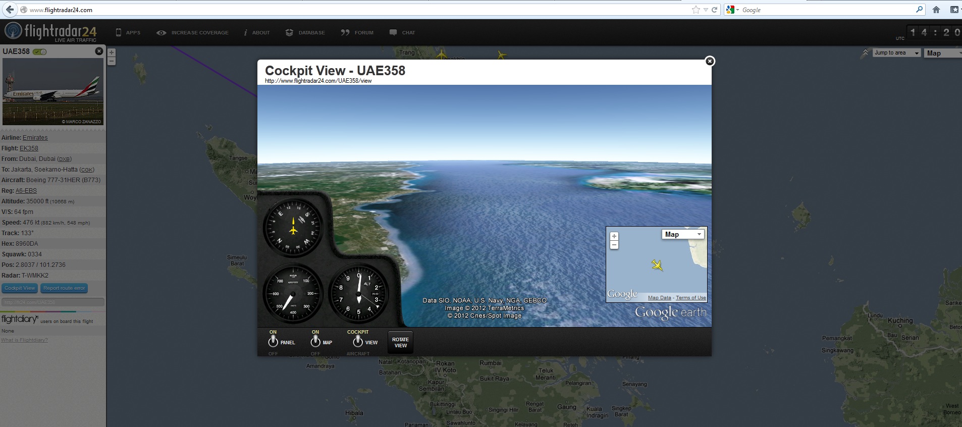 Saya mendapatkan hasil pencarian yang langsung bisa dilihat di peta-nya seperti nampak pada gambar di samping. Dari sana saya bisa mendapatkan informasi jalur lintasan pesawat, posisi pesawat sampai dimana yang bisa terlihat di peta, dan beberapa keterangan lainnya yang ditampilkan di panel sebelah kiri. Saya juga bisa melihat kira-kira view seperti apa yang dilihat oleh pilot dengan meng-klik menu cockpit view