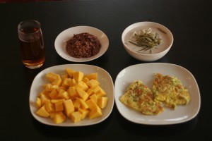 Untuk persiapan berbuka puasa di hari pertama kali ini, saya memasak sendiri sekaligus untuk mengisi dan menghabiskan waktu agar terasa cepat berlalu menjelang waktu berbuka. Pertengahan bulan Juni 2012 kemaren, saya pulang ke tanah air, untuk bertemu dengan seorang teman yang baik, dan saya diajak oleh dia untuk makan siang di sebuah rumah makan Sunda , Sambara namanya, yang lokasinya ada di seputaran Jalan Wolter Monginsidi, Jakarta Selatan. Waktu itu kami memesan masakan Sunda yang disajikan dengan beras merah. Nah sejak saat itu saya mencoba untuk mengkonsumsi beras merah ini, apalagi hasil medikel cekup saya bulan Mei kemaren dokter memberi nasehat untuk mengkonsumsi low fat, katanya kolestrol saya sudah tinggi. Beras merah banyak yang menyarankan untuk dikonsumsi karena baik untuk kesehatan. Beberapa minggu lalu saya pulang ke tanah air lagi, dan sepulangnya dari tanah air, saya membawa 5Kg beras merah untuk dikonsumsi sehari-hari. Nanti kalau beras merahnya habis, ya beli lagi balik ke Indonesia hihi. Nah sore ini saya menyiapkan hidangan buka puasa dengan menu beras merah, sayur lodeh kacang panjang, sambel terasi, telur dadar, dan irisan buah mangga. Untuk minumnya cukup dengan es teh manis saja, twinings earl grey. Menu yang sederhana, dimasak sendiri, dan disantap sendiri.