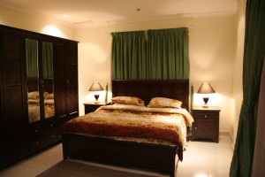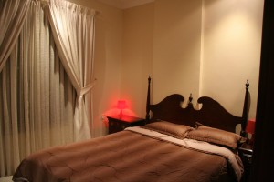 memasuki flat, nuansa dindingnya bermotif (wall paper) berwarna coklat kekuningan, selaras dengan lampu penerangan sepanjang hall menuju ruang tengah. Di dinding terpampang beberapa lukisan repro menambah enak suasana di dalam flat. Begitu memasuki apartemen, ada kamar tidur di sisi kanan. Ukuran kamar lumayan besar, 4x4m dengan bed berukuran king size 2x2m. Kamar ini dilengkapi dengan meja rias dan lemari pakaian 5 pintu yang diletakkan di pojok kamar. Lampu tidur diletakkan di samping kanan dan kiri tempat tidur, dan kamar mandi dengan bathtub dan shower ada di dalam kamar.