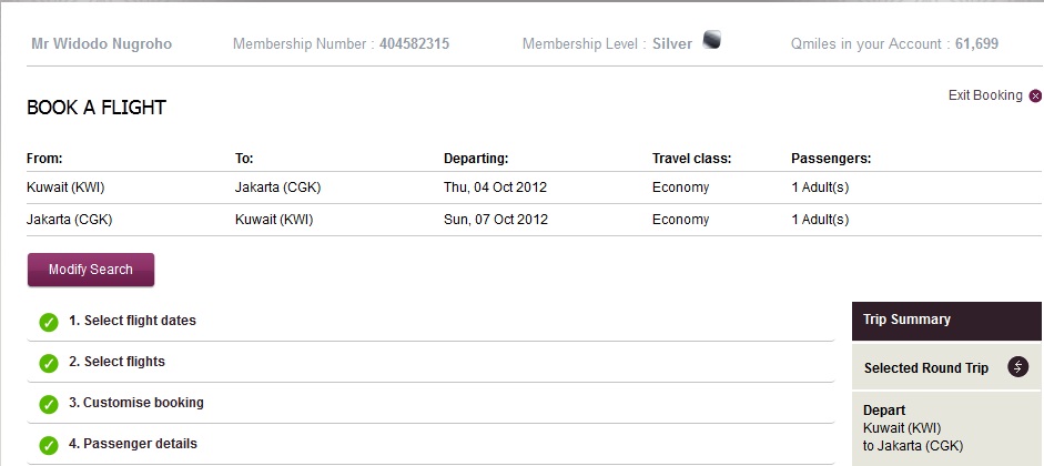 Dari gambar di atas terlihat, total “uang” yang harus saya bayar untuk perjalanan dari Kuwait – Jakarta (return, pulang-pergi) adalah 35000 Qmiles + pajak (sebesar 74.7 KD atau kurang lebih setara dengan Rp 2.5 jt). Artinya saya hanya perlu membayar sejumlah uang Rp 2.5 jt untuk tiket pulang-pergi dari Kuwait – Jakarta. Murah bukan?