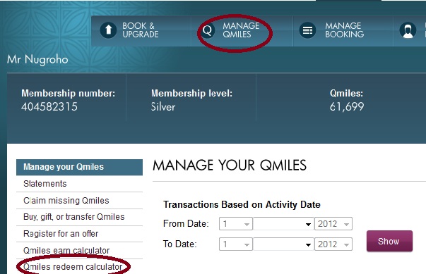 - Masukkan Nomer keanggaotaan dan pin anda, kemudian klik tombol “Login” di pojok kanan bawah dari window login diatas. Sesaat kemudian anda akan menuju ke window baru. Untuk mengetahui berapa Qmiles point yang anda butuhkan untuk menuju ke kota/negara tujuan anda, klik “Manage & Qmiles” > “Qmiles Redeem Calculator”