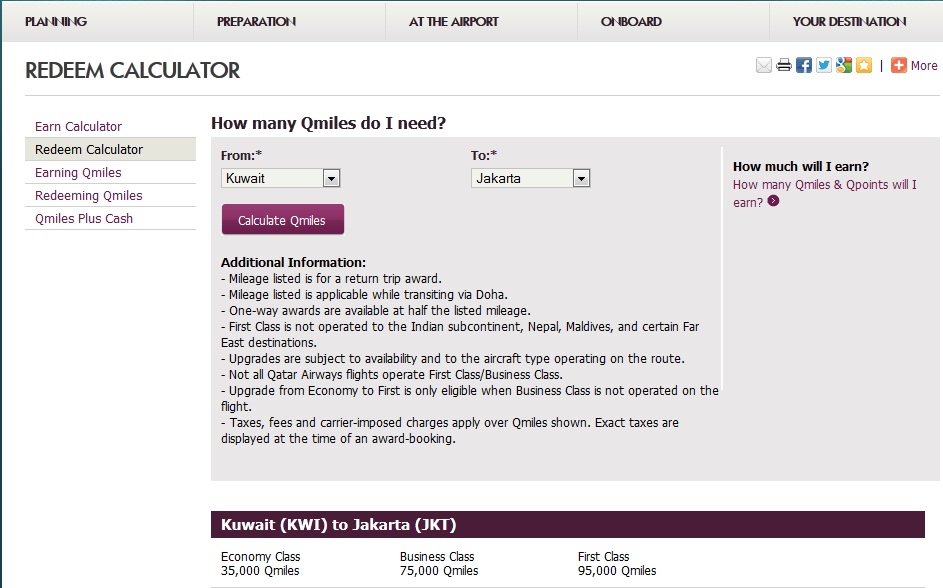 - Masukkan asal dan tujuan keberangkatan anda. Misalnya contoh untuk saya, akan saya masukkan dari Kuwait ke Jakarta. Kemudian klik tombol “Calculate Qmiles”. Dari kalkulator Qmiles akan terlihat dibutuhkan 35000 Qmiles untuk mendapatkan tiket “gratis” dari Kuwait ke Jakarta. Sebenarnya bukan gratis benar-benar gratis, tetapi hanya membayar pajak, sedangkan harga tiketnya sendiri benar-benar gratis.