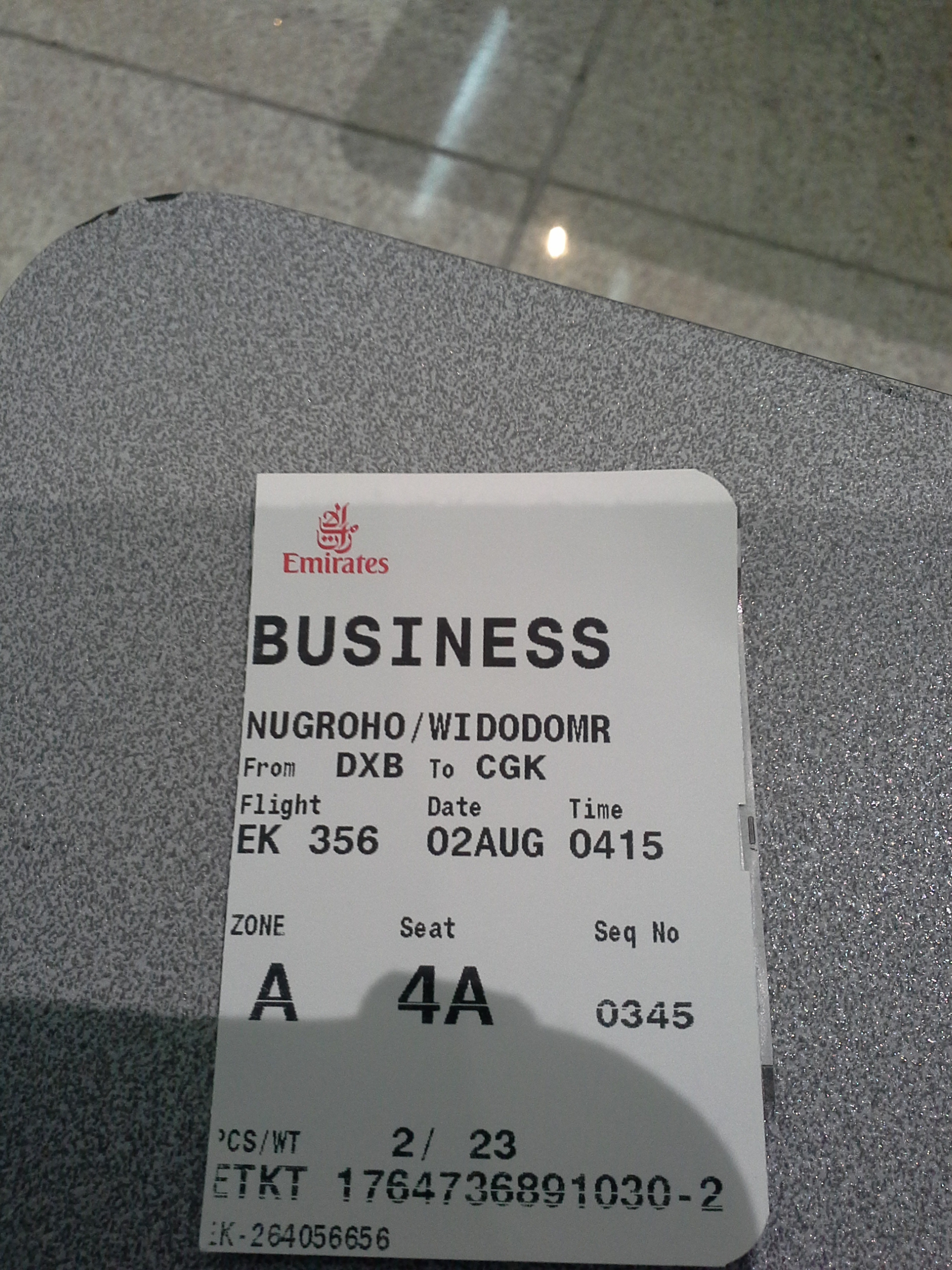 Dengan duduk di kelas bisnis, perjalanan mudik selama 7-8 jam dari Dubai menuju Jakarta2013-08-02 04.08.33 terasa lebih nyaman. Walaupun di kelas bisnis banyak ditawarkan ragam pilihan makanan dan minuman, Alhamdulillah saya tidak tergoda untuk membatalkan puasa saya. Saya masih tetap puasa heheh. Saya pernah menuliskan suasana duduk di kelas bisnis Emirates. Sepanjang perjalanan untuk menghabiskan waktu supaya berlalu lebih cepat, apalagi ketika duduk di kelas bisnis dan saya tidak bisa makan dan minum heheh, yang saya lakukan adalah nonton beberapa film dan tentu saja tidur. Paling tidak saya masih lebih nyaman dibandingkan penumpang lainnya yang tetap berusaha mempertahankan puasanya dan mereka duduk di kelas ekonomi. Jadi tentunya tidak ada alasan sama sekali bagi saya untuk tergoda dan membatalkan puasa. Alhamdulillah sampai pesawat Emirates mendarat di Jakarta kurang lebih pukul 16.00, puasa saya masih full..